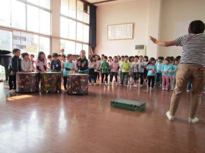 今日は,5歳児ゆり組が,待賢幼稚園に行きました。そこには,待賢・竹田・深草・開智・楊梅の5歳児のみんなも集まっていて,みんなで120人!そのたくさんのみんなと一緒に楽器遊びをしました。