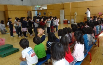 今日は、年中児と年少児がお客さんになって「うたと楽器あそび」を見ることにしました。