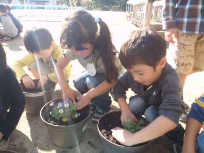 年長のゆり組は,チューリップとビオラの花を自分の植木鉢に植えました。