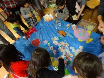 折り紙や魚釣り、手裏剣投げなどなど、いろいろなコーナーで遊びます。