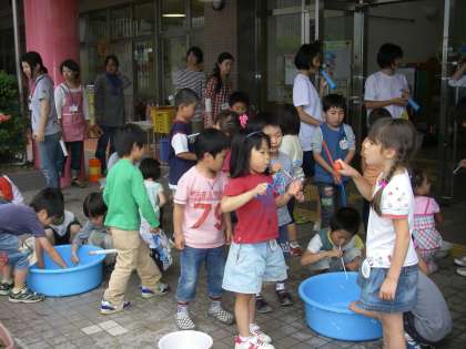 子どもたちは,ストローや糸巻の芯,紙筒などいろいろなもので試して楽しんでいました。風がきつかったので,シャボン玉が風にのり流れていったりして,きれいでした。小さなシャボン玉に囲まれた子どもたちもいました。
