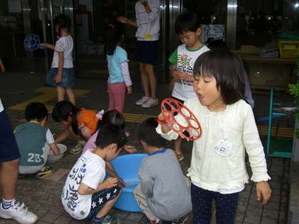 どうにかして,大きなシャボン玉をつくろうとして息を吹きかけるのをゆっくりにしたり,静かに液から上げてみたり,友達のしているのをジーっとみていたり・・・。