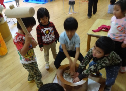 子どもも先生も一緒に掛け声をかけながら、テンポよくもちつきごっこを楽しみました。
