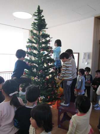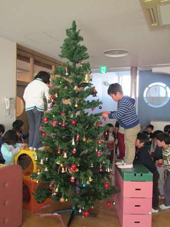 みんなで手を伸ばしたり、台に乗ったりして飾りを付けました。