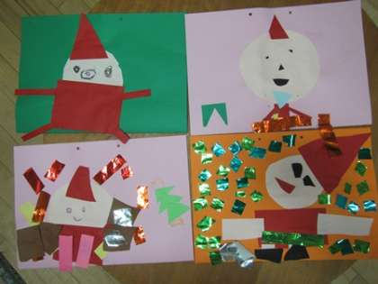 4歳児はサンタさんを切って貼ってつくっています。