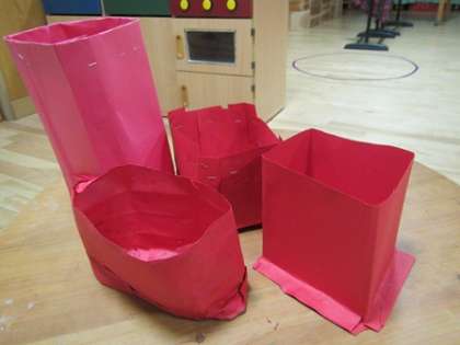 5歳児は一枚の紙からのりやステープラ—をつかって立体の箱をつくっています。