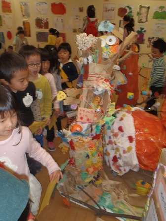自分たちがつくった動物や電車などを見たり、他の幼稚園の子どもたちがつくったりかいたりしている作品を見たりしました。