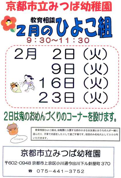 いよいよ2月!寒いですが,元気にお過ごしでしょうか?幼稚園に来て,また楽しくあそびましょう!