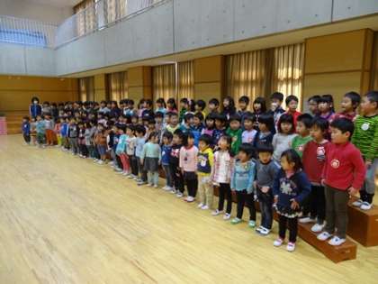 幼稚園には子どもたちの歌声や、ごっこ遊びの楽しい声が響いています。今日はクラスのみんなで歌を歌い、他のクラスの子どもたちがお客さんになりました。