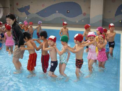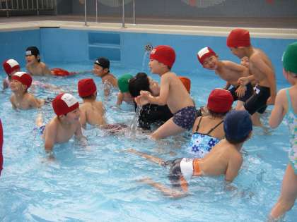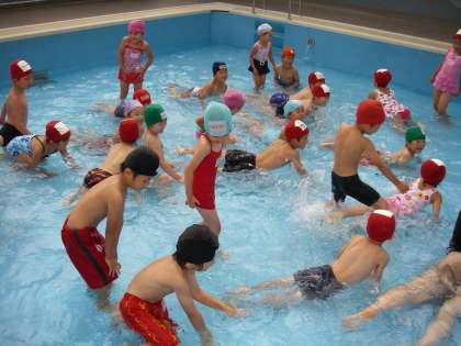 初日なのでまだプールの水の深さは20cmです。「ちょっと冷たい〜」といいながらもプール遊びを楽しんでいました。みんなでつながって走ったり,ワニやラッコになったりして浅い水深ならではの楽しみ方を満喫していました。