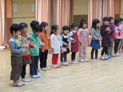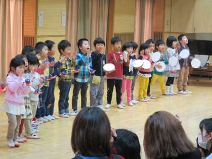 「たのしいね」の曲に合わせての楽器遊びではリズムに合わせて楽器を鳴らします。曲の歌詞のように「素敵な音」が響きましたよ!