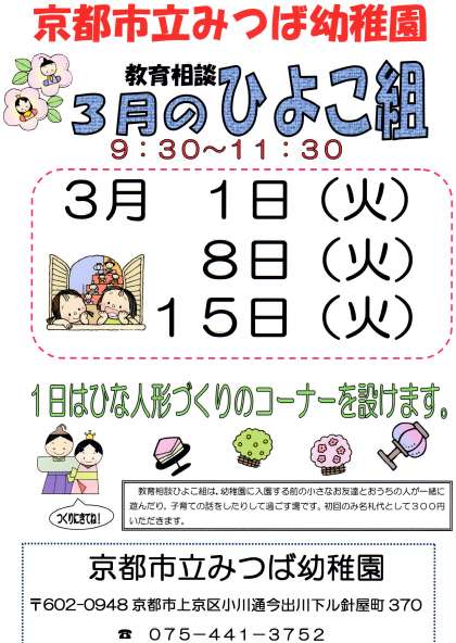いよいよ3月のひよこ組のご案内です。1日にはおひなさんもつくります。ぜひ来てくださいね!