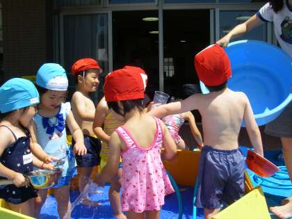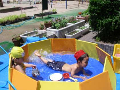 今日はとても暑い日になりました。絶好のプール日和です。この間のプール開きはちょっと冷たかったのですが,3歳の子どもたちも,今日はゆっくりプールを楽しんでいました。