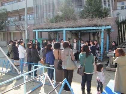 幼稚園が終わる時間、子どもたちを迎えにきたおうちの方々が園庭に集まります。