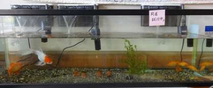 金魚の水槽に大きな金魚が2匹いますが、そこに、3匹の金魚を入れました。