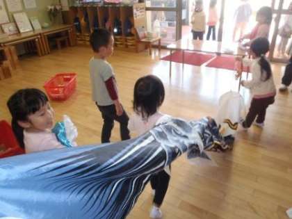 子どもたちはこいのぼりを持って,廊下をよーいどん!