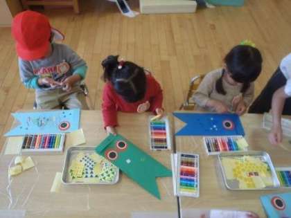 保育室では,新しいクレパスといろいろな形のシールでこいのぼりづくりです。