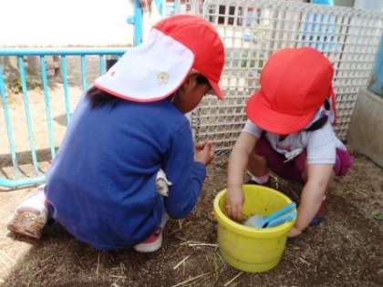 年少組のAくんは,使いたかったスコップを拾って使おうとしました。でも,それは年中組のBくんが使っていたものだったのです。