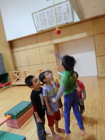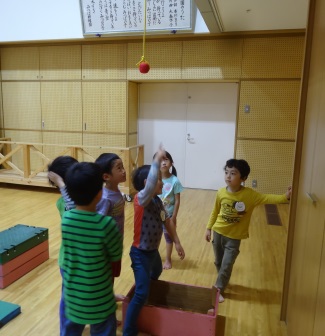 ある子どもは巧技台を持ってきてその上に乗れば玉に手が届くと考えたようです。(写真中)