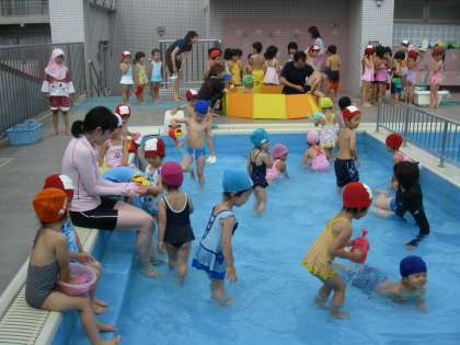 たんぽぽ組,もも組の子どもたちも今週から屋上のプールに入っています。
