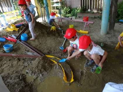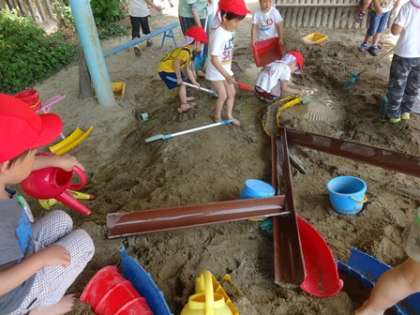 砂場では、といなどを使って、水を流したり、穴を掘って水を入れたりして、砂と水の感触を心地よく感じながら遊んでいます。