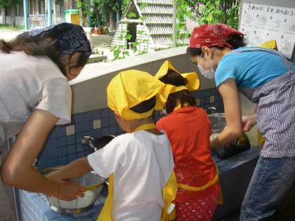 ばら組は,ジャガイモの皮剥きです。新じゃがなので,水道でたわしでゴシゴシしながらジャガイモを洗いました。きれいになったジャガイモをばら組もお母さん先生のところに運んでいきました。
