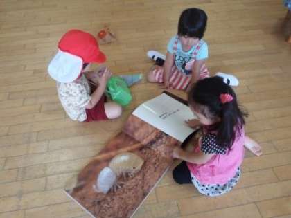 3人で仲良く絵本と本物のダンゴムシを見比べて楽しんでいました。(写真2枚目)