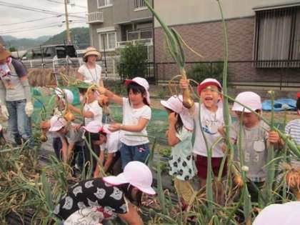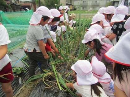 5歳児が西賀茂の畑の玉ねぎを収穫しました。