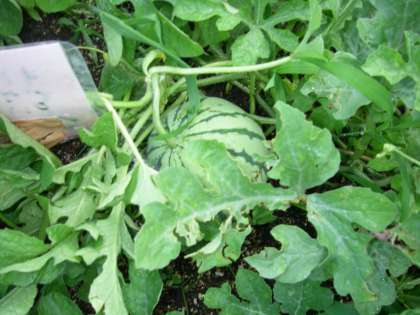 葉っぱの陰に隠れてスイカも2つ3つ顔を覗かせています。去年はコダマスイカでしたが,今年は普通のスイカを植えました。さあ,どんなスイカができるか楽しみですね。