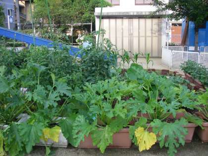 さて,梅雨の雨をいっぱい吸って,園庭の夏野菜がどんどん実がなったり,大きく生長したりしてきています。キュウリが次々できているし,今年はズッキーニの生長ぶりが素晴らしいです。実も次々できています。