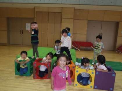 大きなふかふかのマットをおうちにして,おうちに入っていると鬼につかまらないという簡単なルールです。子どもたちがカラーボックスを持ってきて,カラーボックスの中もおうちということになりました。
