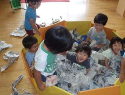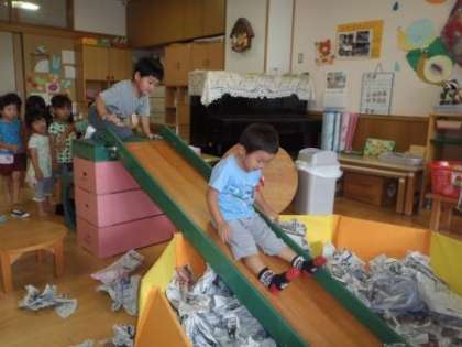 新聞紙をプールの中にたくさん入れて,新聞プールで遊びました。