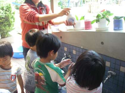 「きれいになったかな?」と洗い終えた手をじっと見ている子どもたちもいました。