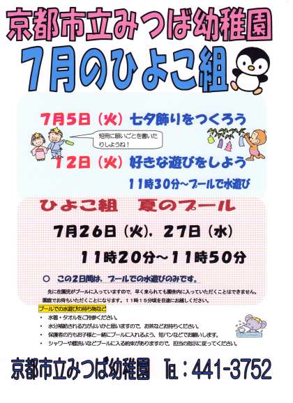 7月も元気にみつば幼稚園に遊びにきてくださいね。屋上のプールにも入って遊びましょうね。待っていますよ。