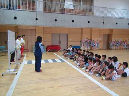 上京警察署から指導に来ていただき、5歳児を対象に交通教室を行いました。