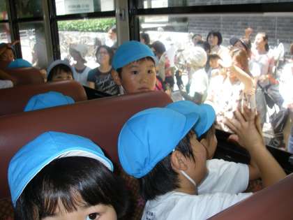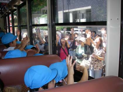 席に座り,窓越しに見送りにきていただいていたお家の人に「さようなら〜」と手をふっていました。お家の方も一生懸命バスの中を覗き込んで,「どこにいるかな?」とお子さんを確認されながら,大きく手を振って見送ってくださいました。