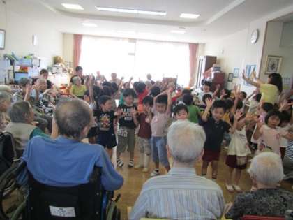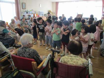 隣の特別養護老人ホームを訪問し、おじいちゃん、おばあちゃんたちの前で、歌を歌ったり手遊びをしたりしました。