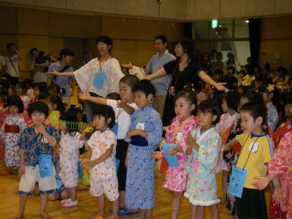 そしてみんなでフラダンスを見ました。途中で「見上げてごらん夜の星を」の曲に合わせて踊り方を教えていただきました。子どもたちはとてもしなやかに手や足を動かして踊りを楽しんでいました。