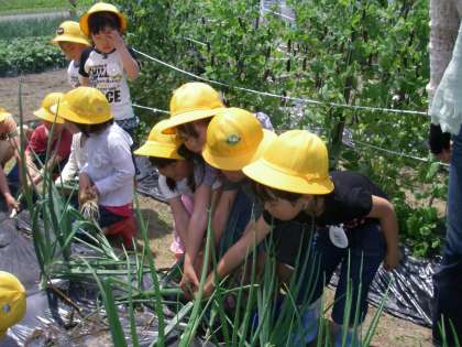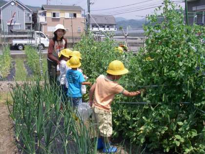 5月11日,ゆり組の子どもたちが,去年西賀茂農園で種まきをしたえんどう豆の収穫に出かけました。予定していたより,天候が不順だったため,たくさんできているものの実の太り加減が今一つ・・・という感じだったので一房ずつみんなで確かめ合いながら,収穫しました。それでも33人が一人5房ずつ取れました。