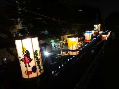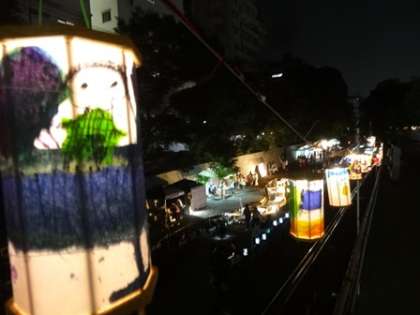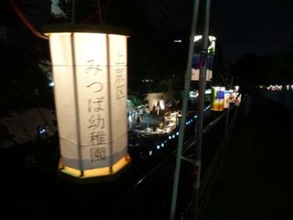 幼稚園の親子でかいた短冊と、5歳児がかいた行燈が飾られています。