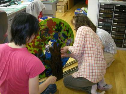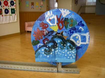 京の七夕の行事で堀川に設置する水車を子どもたちが,水の中や森の中をイメージしてかいてくれていました。