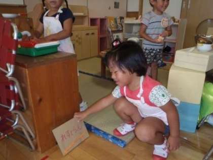 レストランごっこでは,看板が飾りたいからつくって,と先生に頼み素敵な看板ができました。