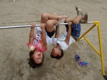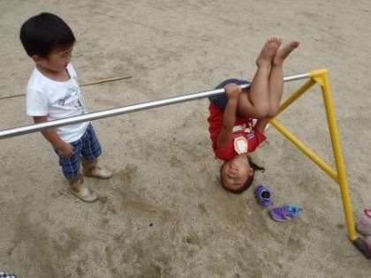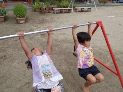 さっそく見つけてぶら下がって遊ぶ年少組の様子。