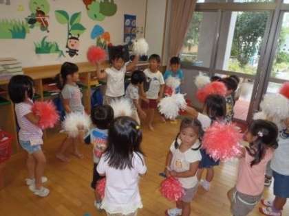 ゆり組さんに「右手に赤だよ」と教えてもらって,ポンポンをつけるともう早く踊りたくてたまりません。