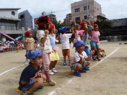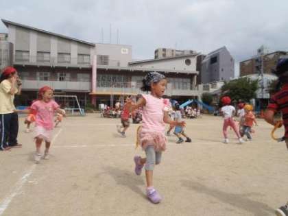 今日は,全園児が園庭に集まって,色々な学年の運動会を見ました。