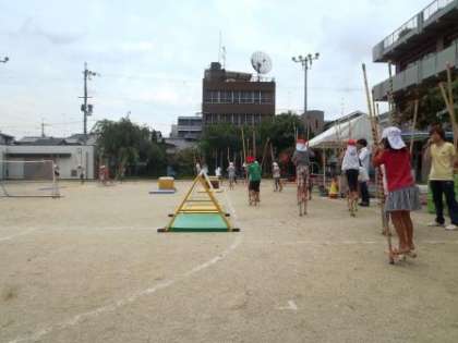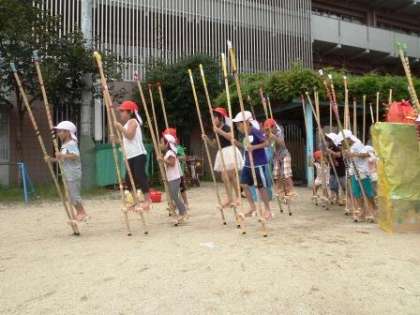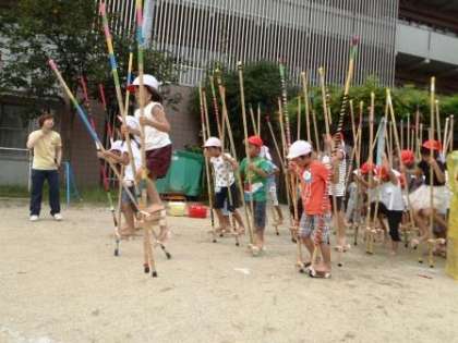 去年の年長組の姿を見て,一生懸命みんなで竹馬に挑戦しています。