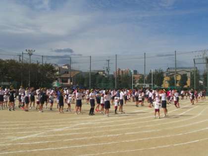 上京中学校の体育大会では、中学3年生と一緒に「げんきっきたいそう」をしました。