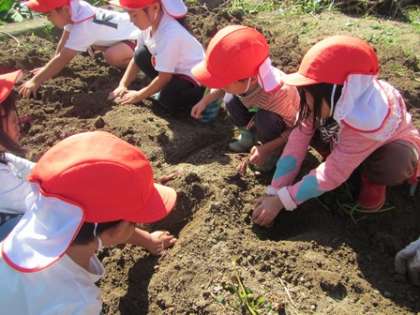 子どもたちはサツマイモの赤い色を土の中に見つけると、