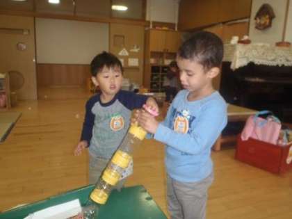 たらいに入ったたくさんのドングリを,最初はペットボトルの筒に入れるなどして転がすことを楽しんでいたのですが,だんだん楽しくなってきて,何度もたらいに全部集めては全部転がすことを楽しんでいました。