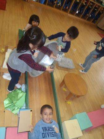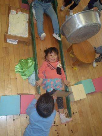 昨日遠足でたくさん拾ってきたドングリを転がして遊びました。